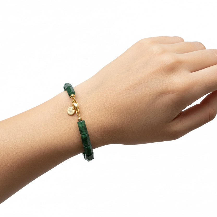 This faceted emerald-cut log bracelet showcases its natural beauty with precision-cut geometric facets that catch the light beautifully. The knotted design adds organic texture and movement, while the 14kt gold-fill clasp provides both durability and refined elegance. At 7.25 inches, it offers a comfortable fit for most wrists. A sophisticated piece that bridges natural materials with fine jewelry craftsmanship, perfect for layering or wearing alone.