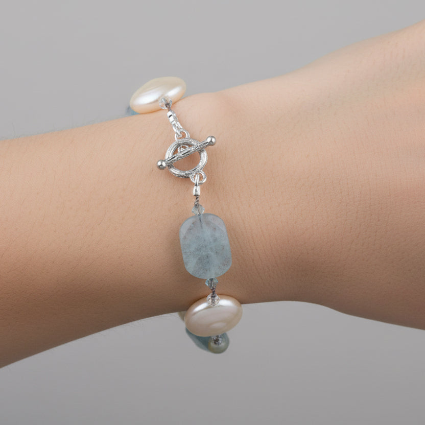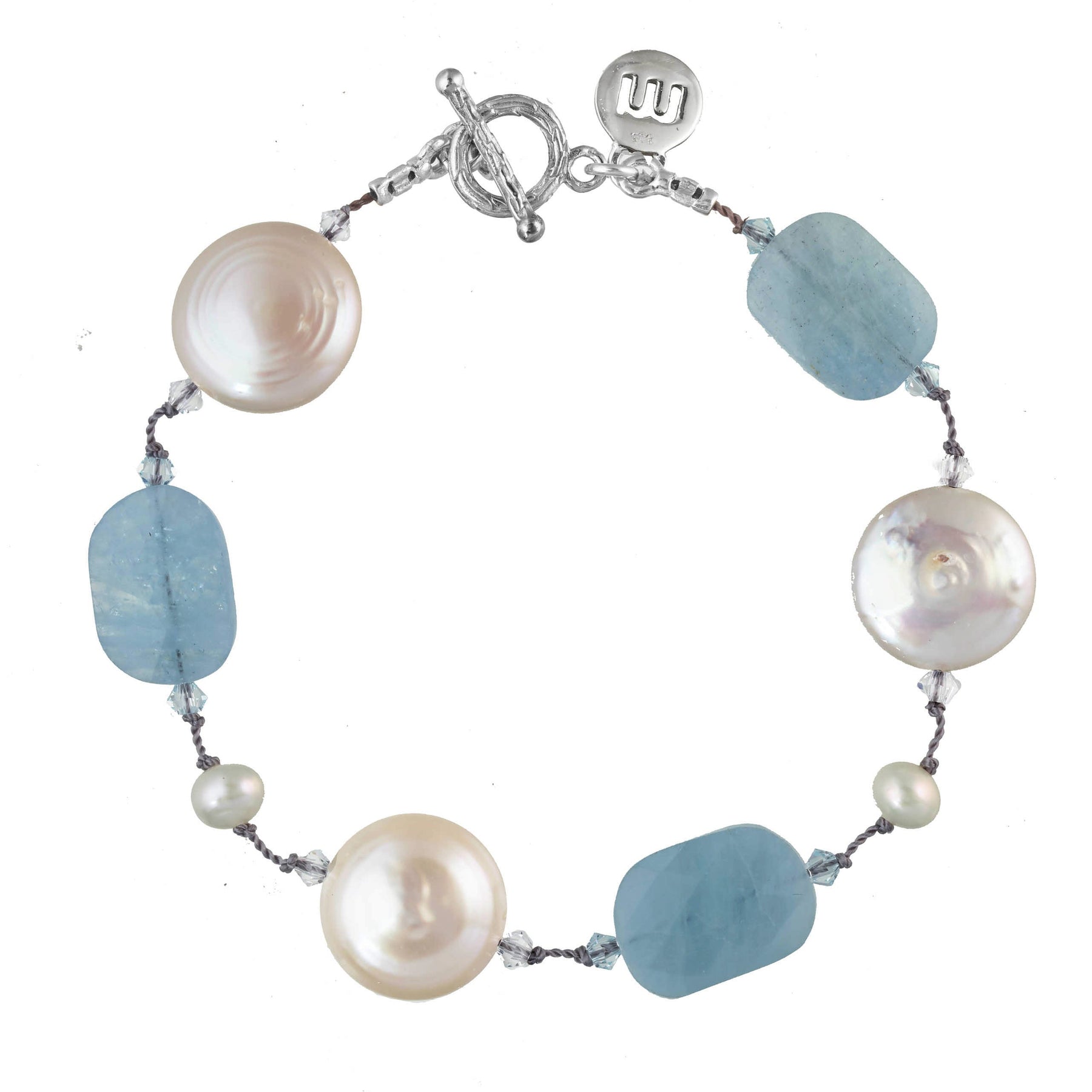 Delicate yet refined, this knotted bracelet showcases flat faceted aquamarine, complemented by lustrous white freshwater pearls in both coin and round shapes. Hand-knotted construction ensures durability while allowing natural movement, and the sterling silver clasp provides secure closure with understated elegance. At 7.25 inches, it offers a graceful fit for most wrists. The interplay of the aquamarine's crystalline brilliance with the pearls' soft iridescence creates a sophisticated piece suitable for both everyday wear and special occasions.
