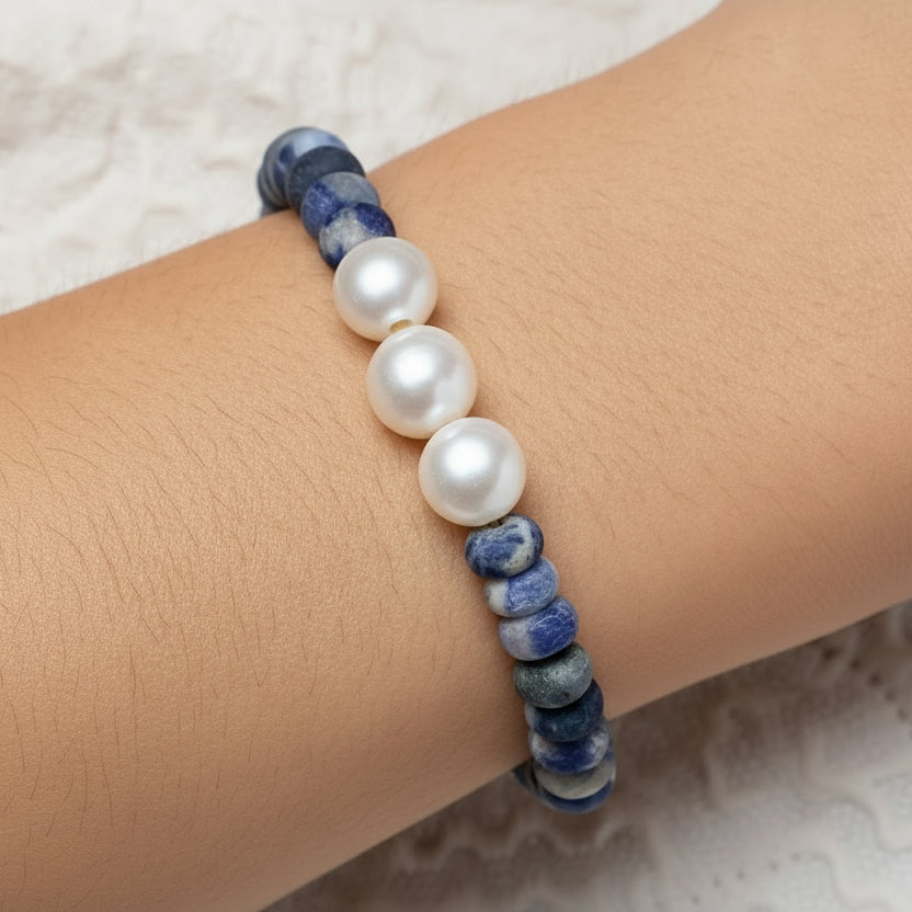 Crafted with matte blue sodalite beads and three luminous white round freshwater pearls, this stretch bracelet combines natural elegance with understated sophistication. The 7.25-inch circumference offers a comfortable fit, while the interplay between the deep, calming sodalite and the lustrous pearls creates a refined aesthetic. Ideal for layering or wearing alone, this piece brings timeless appeal to any jewelry collection.