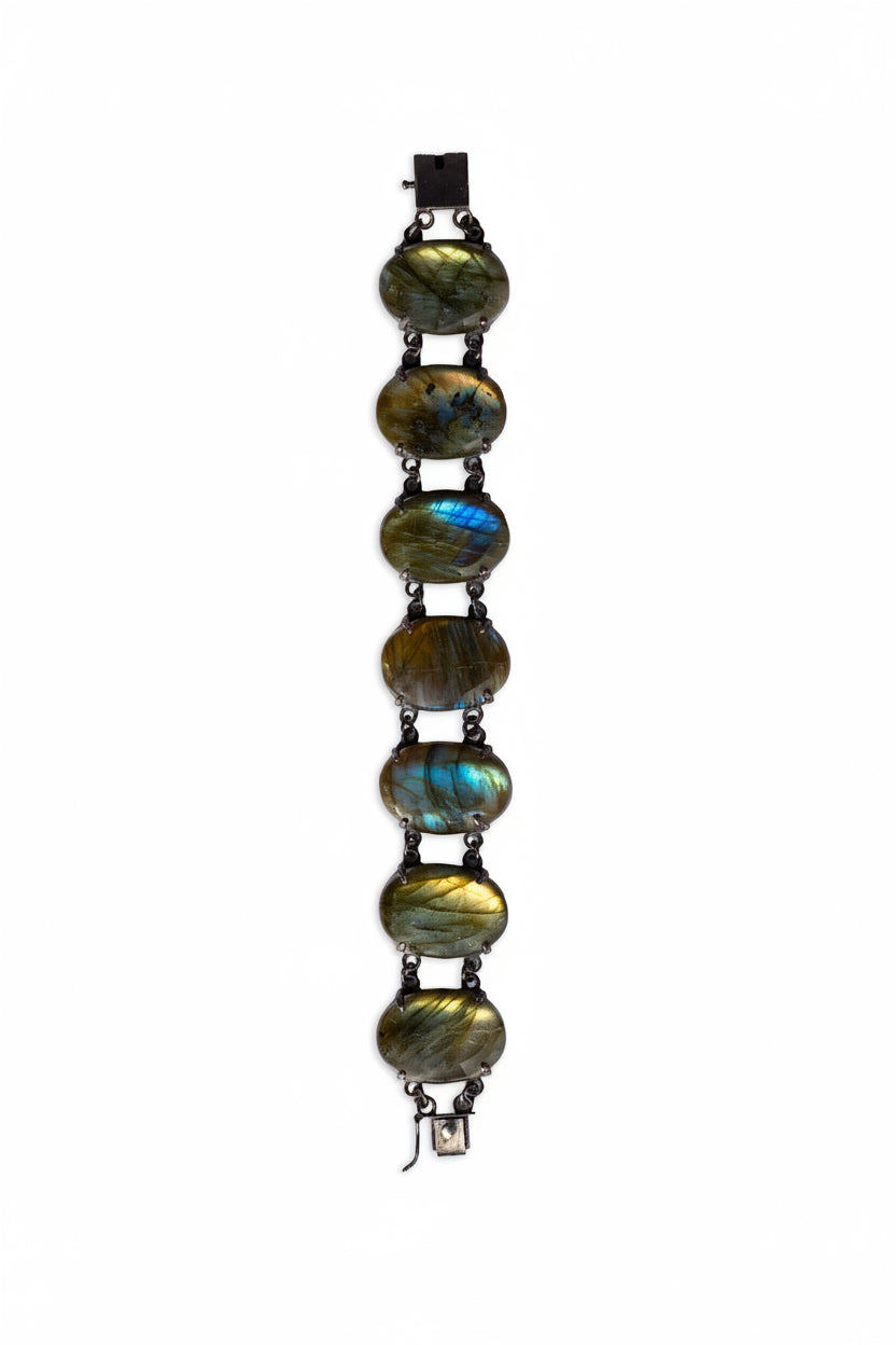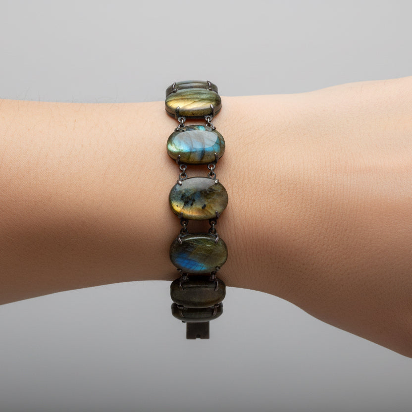Luminous labradorite cabochons showcase their signature flash and depth when set in this refined sterling silver bracelet finished with rhodium plating. The smooth, polished stones catch light beautifully, revealing the gemstone's characteristic play of color. Crafted with precision metalwork, the rhodium coating provides enhanced durability and a sophisticated silvery sheen that complements the stone's natural iridescence. At 7.25 inches, this bracelet offers a comfortable fit for most wrists. An elegant piece that bridges contemporary design with the timeless appeal of labradorite's mystical optical properties.