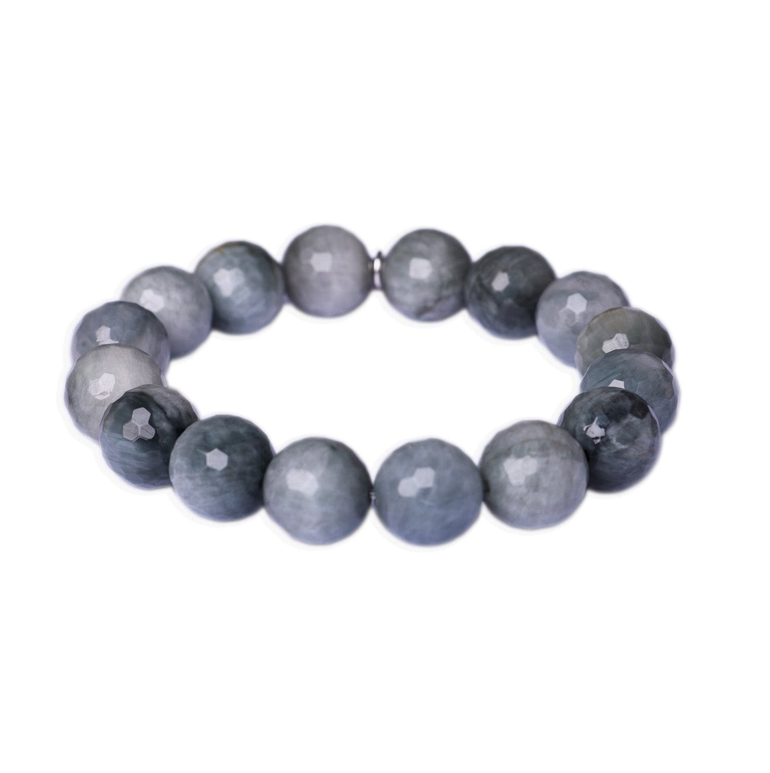 This striking stretch bracelet features a faceted eagle eye stone, showcasing the stone's distinctive banding and natural depth. The 7.25" length offers a comfortable fit for most wrists, while the elastic construction ensures easy on-and-off wear without compromising durability. Eagle eye is traditionally valued for its grounding properties and protective energy. The faceted cut enhances the stone's visual appeal, catching light beautifully throughout the day. An understated yet sophisticated accessory for those who appreciate meaningful gemstone jewelry.