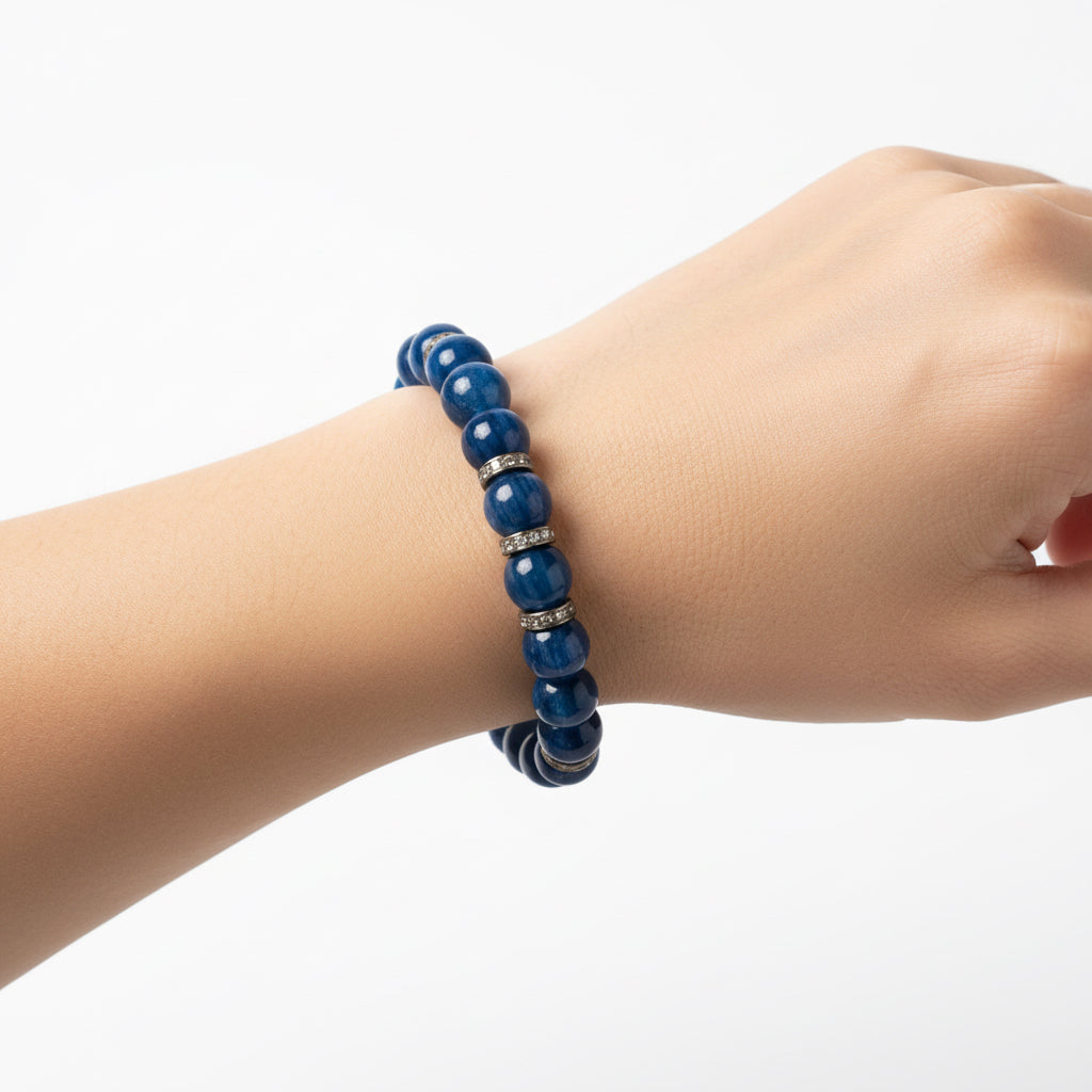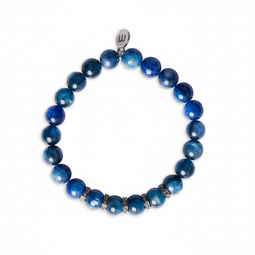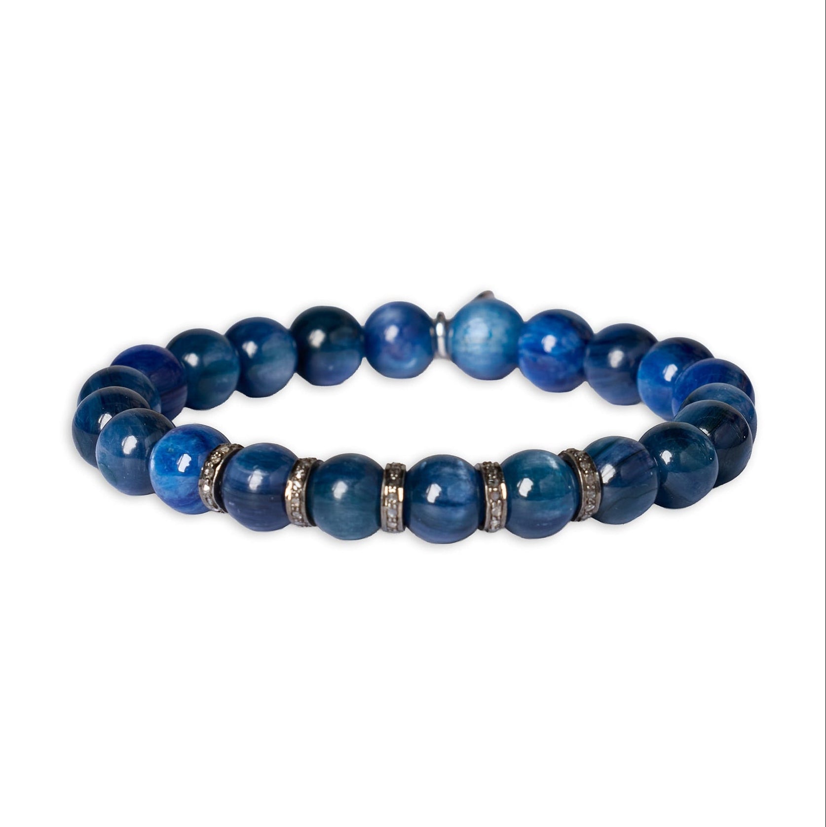 This refined bracelet features a smooth 8mm kyanite ball, complemented by five sterling silver rondelles adorned with pavé diamonds that catch light beautifully. Crafted for versatility, the stretch design accommodates wrists up to 7.25 inches while maintaining an adjustable fit. The combination of natural stone and precious metal creates a sophisticated piece suitable for both everyday wear and special occasions, offering understated elegance with genuine gemstone appeal.