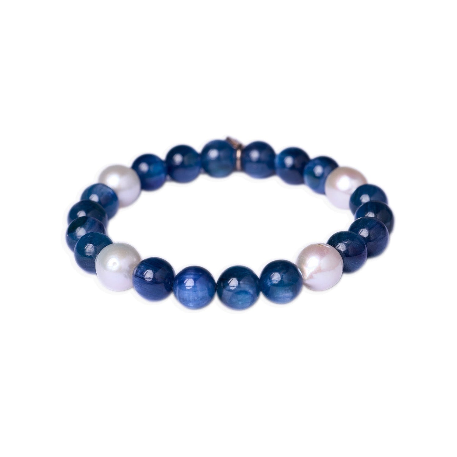 Elegant stretch bracelet featuring smooth kyanite spheres paired with four lustrous white baroque pearls. The kyanite's serene blue tones complement the organic irregularity of baroque pearls, creating sophisticated visual contrast. Measuring 7.25 inches, this piece offers a refined aesthetic suitable for layering or worn alone. The stretch construction ensures comfortable, adjustable wear for various wrist sizes. A versatile addition to any jewelry collection that balances contemporary design with timeless pearl elegance.
