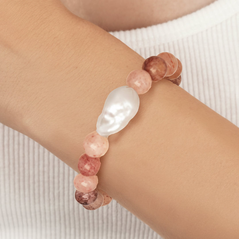 This elegant stretch bracelet combines the gentle energy of natural strawberry quartz with a striking white baroque pearl. The smooth quartz ball catches light beautifully, while the lustrous baroque pearl adds organic sophistication. Sized at 7.25 inches with adjustable stretch construction, it adapts to your wrist for comfortable everyday wear. A refined piece that balances natural beauty with understated luxury.