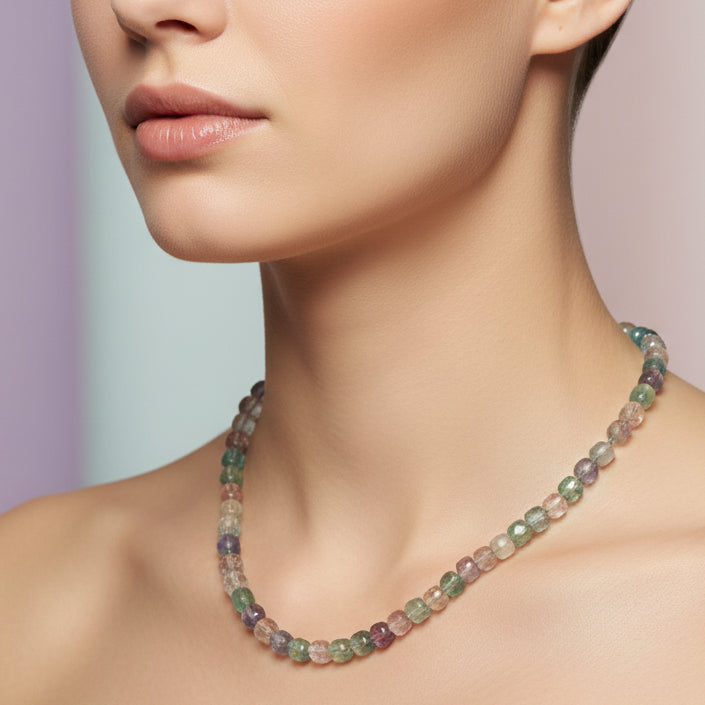Faceted multicolor fluorite cube cut